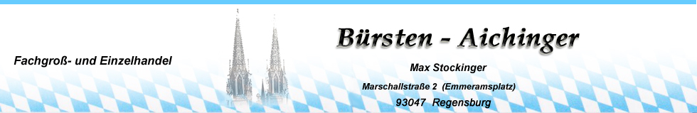 Bürsten-Aichinger in Regensburg hat nicht nur Bürsten! Wir sind Fachgroßhändler für Bürsten, Besen, Pinsel, Fußmatten und Kaminkehrerwerkzeuge. Als Endverbraucher profitieren Sie von unseren günstigen Einzelhandelspreisen. Wir führen auch Rohrbürsten und Heizkesselbürsten und freuen uns auf Ihren Besuch.